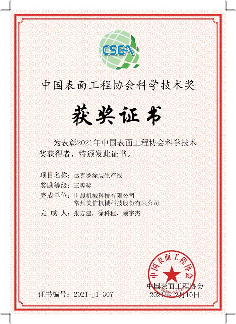 熱烈祝賀世晟集團子公司(達克羅涂裝生產線項目)喜獲2021年度“中國表面工程協(xié)會科學技術獎”三等獎
