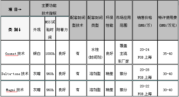 對Geomet系列、Delta-Tone系列、Magni系列三項無鉻技術(shù)進行比較,Geomet無鉻涂料底涂、面涂均為水性涂料,且Geoemt技術(shù)得到國際幾乎所有主流汽車廠家的認(rèn)可,而Delta-Tone系列和Magni系列底涂為水性涂料,但面涂仍為有機溶劑型涂料,只是僅被部分廠商認(rèn)可。